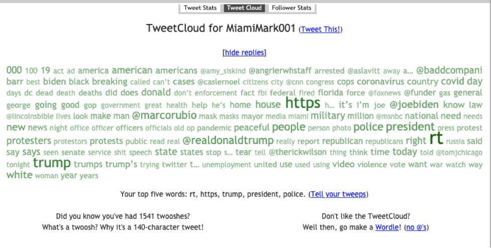 Figure 2: Screen shot of my TweetCloud taken June 7, 2020.